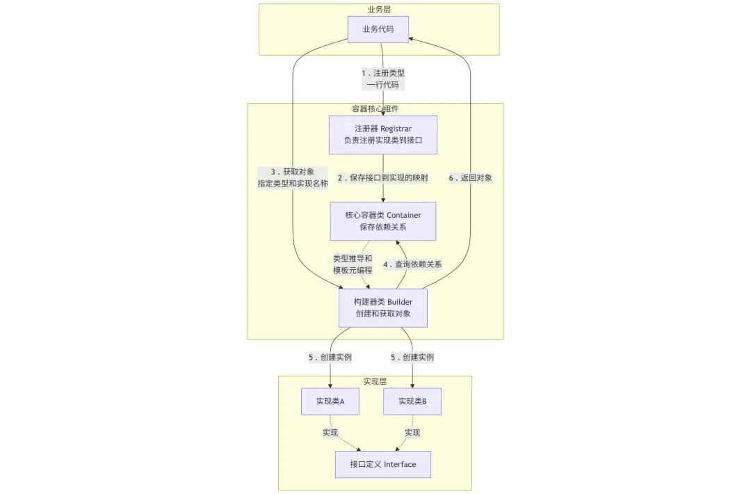 依赖注入容器彻底解决了策略类的创建和依赖管理问题。 类型注册只需一行代码,对象获取只需指定接口类型和实现名称, 业务代码得以专注于逻辑实现本身,对象生命周期管理完全交由容器处理。