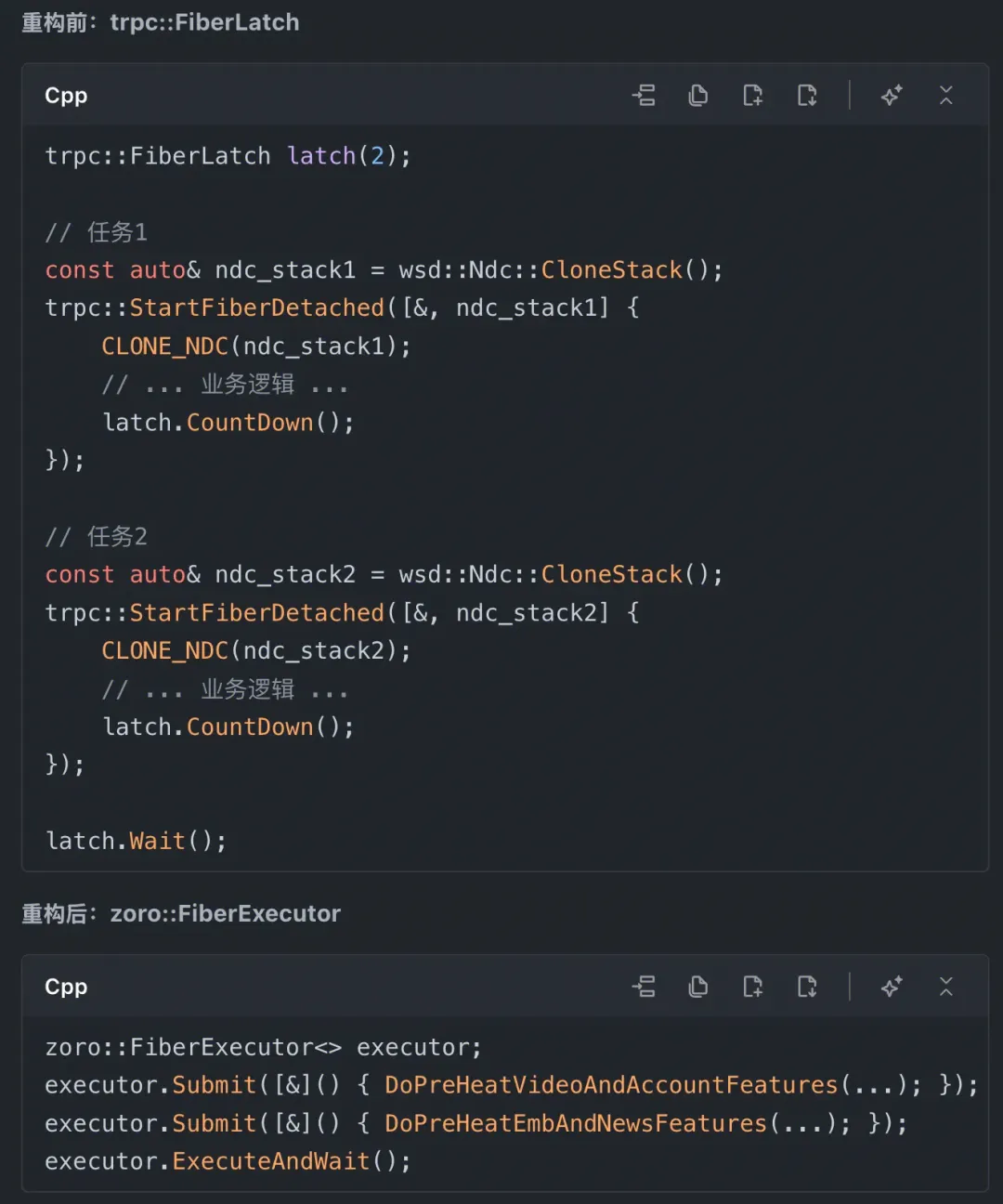 使用方式直观明了:无返回值场景通过链式调用Submit添加任务后调用ExecuteAndWait完成并行执行, 有返回值场景ExecuteAndWait返回按提交顺序排列的结果向量, ExecuteDetached适用于日志记录、异步通知等不关心结果的后台任务。 并行执行从原本需要手动管理多个fiber的复杂操作简化为几行声明式代码。
