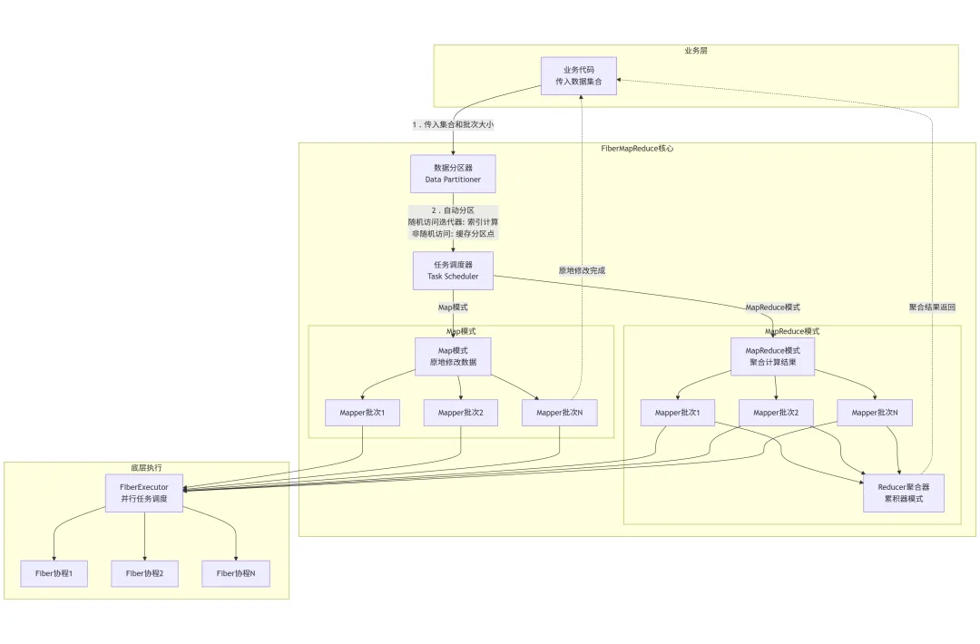 FiberMapReduce组件将MapReduce编程模型引入协程并行处理框架,提供统一的批量数据处理抽象。 支持两种核心模式:Map模式用于原地修改集合数据,MapReduce模式用于聚合计算并返回结果。 组件自动处理数据分区、并行调度和结果收集,业务代码只需关注单个批次的处理逻辑。