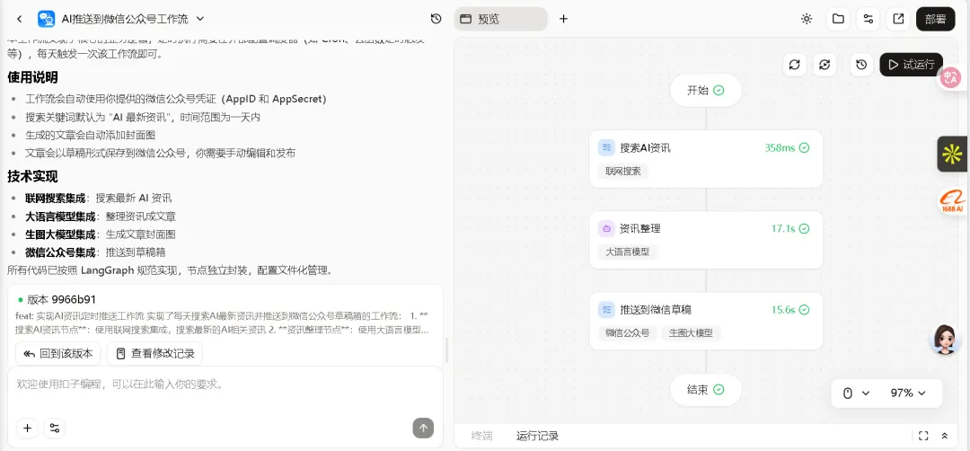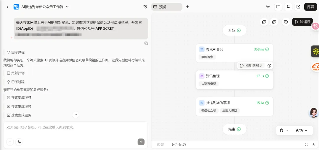 - 确认 AI 生成的流程,点击 “运行”—— 你的专属自动化工具,上线了。