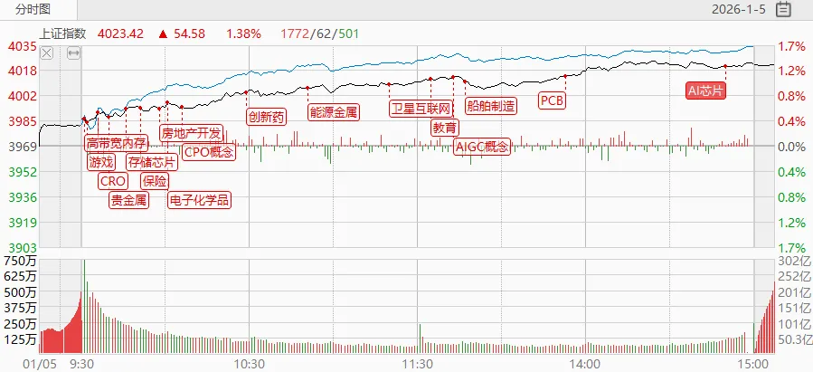 A股1月5日日喜迎2026开门红,沪指12连阳,重新站上4000点大关。截止收盘,沪指涨1.38%,收报4023.42点;深证成指涨2.24%,收报13828.63点;创业板指涨2.85%,收报3294.55点。沪深两市成交额达到25675亿,较上一交易日大幅放量5016亿。
