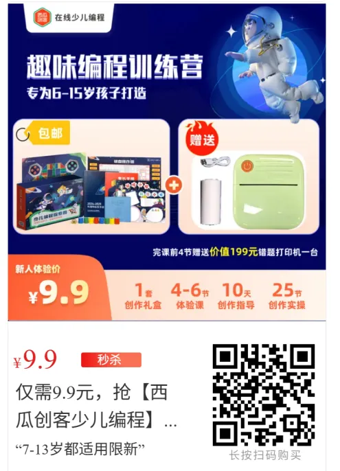 仅需9.9元,抢【西瓜创客少儿编程】完4课+送价值百元[错题打印机]限新用户购买1单