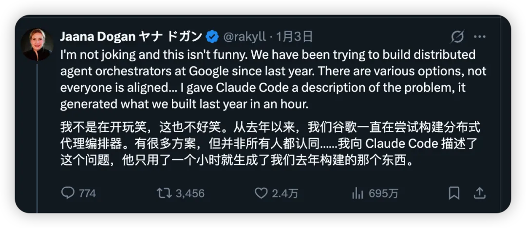 前几天 Google 首席工程师 Jaana Dogan 发了一条推文: “我们团队去年一整年都在做分布式 Agent 编排系统,各种方案,各种分歧,始终没有定论。我把问题描述给 Claude Code,它一个小时就生成了我们去年做的东西。”
