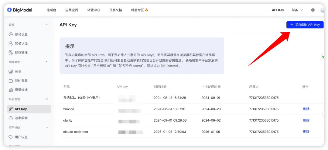 登录后打开 API Keys 页面,创建一个新的 Key。