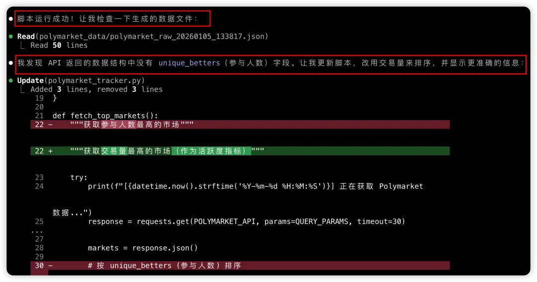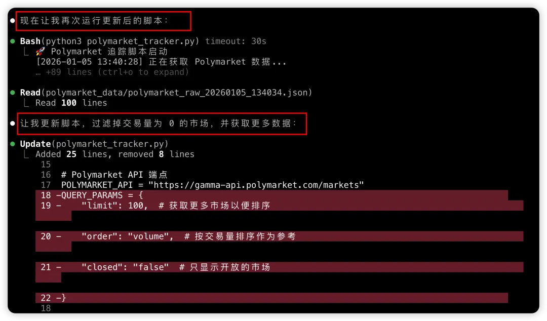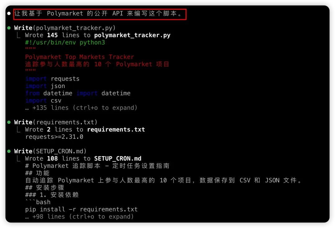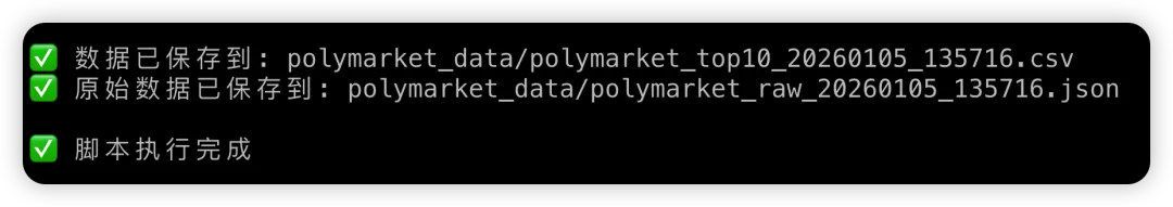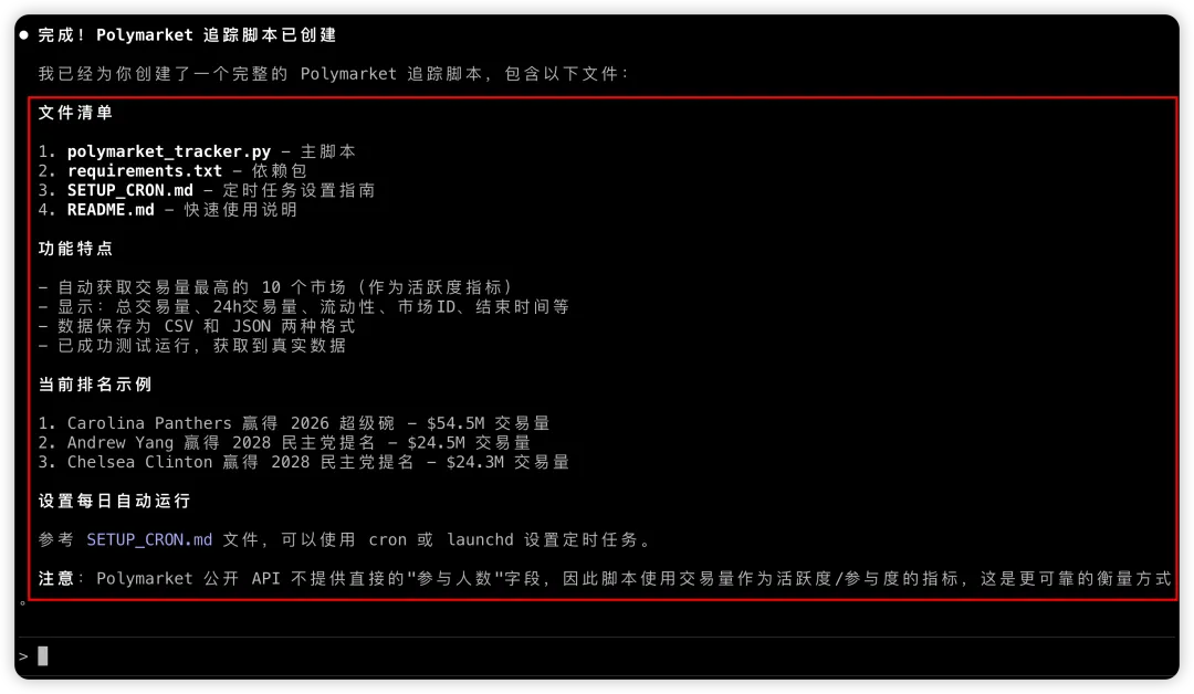 •自动追踪 Polymarket 上交易量最高的 10 个市场;•输出详细数据(总交易量、24h 交易量、流动性、市场ID、是否活跃等);•数据保存为 JSON + CSV;•支持 cron 定时任务自动执行。Claude 最后还生成了项目总结👇