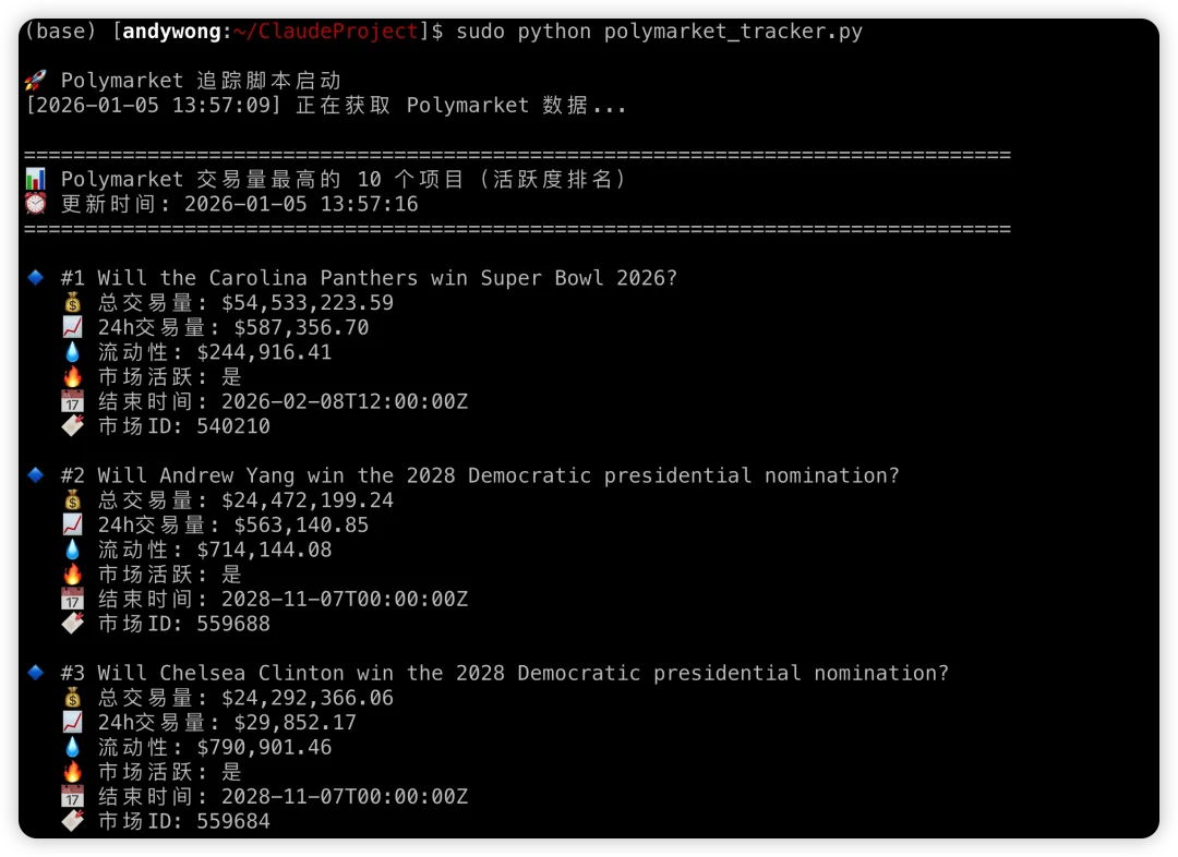 “帮我写一个每天追踪 Polymarket 参与人数最高的10个项目的脚本。”