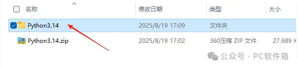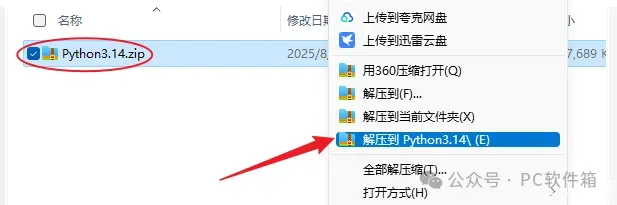 1.解压安装包:鼠标右击【python3.14】压缩包,选择电脑上安装的解压软件,点击解压到【python3.14】。