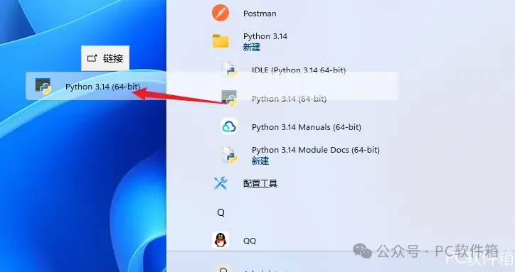 9.创建桌面快捷方式:①点击桌面任务栏中的【开始图标】>点击【所有应用】>双击展开【python3.14】文件夹②将【Python 3.14 64-bit】图标拖到电脑桌面。