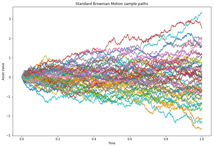 subplots 方法,它能让我们更精细地控制图形和坐标轴的配置。我们指定创建一个单行单列的子图,并以英寸为单位设置图形尺寸(默认分辨率为 100 dpi)。随后,我们遍历所有路径,将时间轴与矩阵 W 中对应的每一行(使用 NumPy 的向量化语法 W[path, :])进行绘图。最后,显示该图形:fig, ax = plt.subplots(1, 1, figsize=(12, 8))for path in range(paths):ax.plot(t_axis, W[path, :])ax.set_title("Standard Brownian Motion sample paths")ax.set_xlabel("Time")ax.set_ylabel("Asset Value")plt.show()