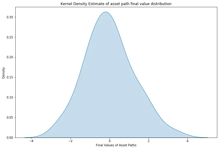 然而,我们可以通过对所生成的 N 条样本路径的终值分布进行量化分析,使这一观察更加严谨。为此,我们可以使用核密度估计(Kernel Density Estimate, KDE),这是一种从有限样本数据中估计连续概率分布的方法。我们将使用 Seaborn 统计可视化库来实现这一点。