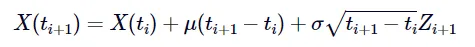 以下公式引自 [Glasserman, 2003] 一书中的公式 (3.2)。该公式给出了在 n 个时间点(时间点不一定等间距)上生成一条(单条)布朗运动路径的递推关系。其核心含义是:在时刻 ti 的新布朗运动路径值,等于前一时刻 ti−1 的路径值,加上时间间隔 Δti=ti−ti−1 的平方根与一个在时刻 ti 生成的标准正态分布随机样本的乘积。