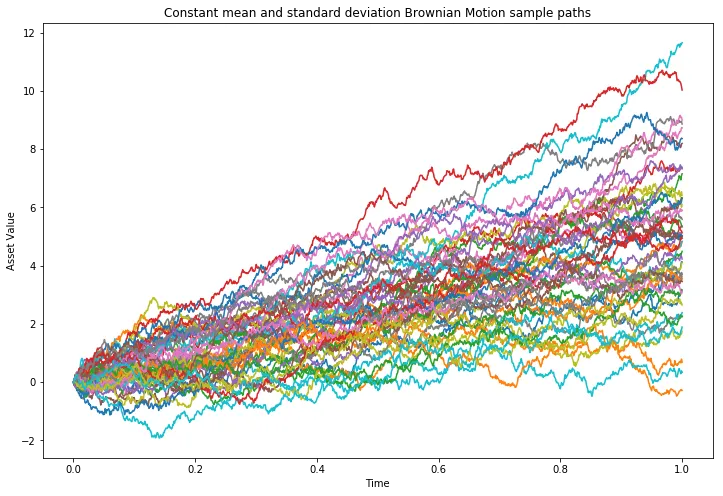 fig, ax = plt.subplots(1, 1, figsize=(12, 8))for path in range(paths):ax.plot(t_axis, X[path, :])ax.set_title("Constant mean and standard deviation Brownian Motion sample paths")ax.set_xlabel("Time")ax.set_ylabel("Asset Value")plt.show()