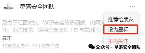 现在只对常读和星标的公众号才展示大图推送,建议大家能把星落安全团队“设为星标”,否则可能就看不到了啦!