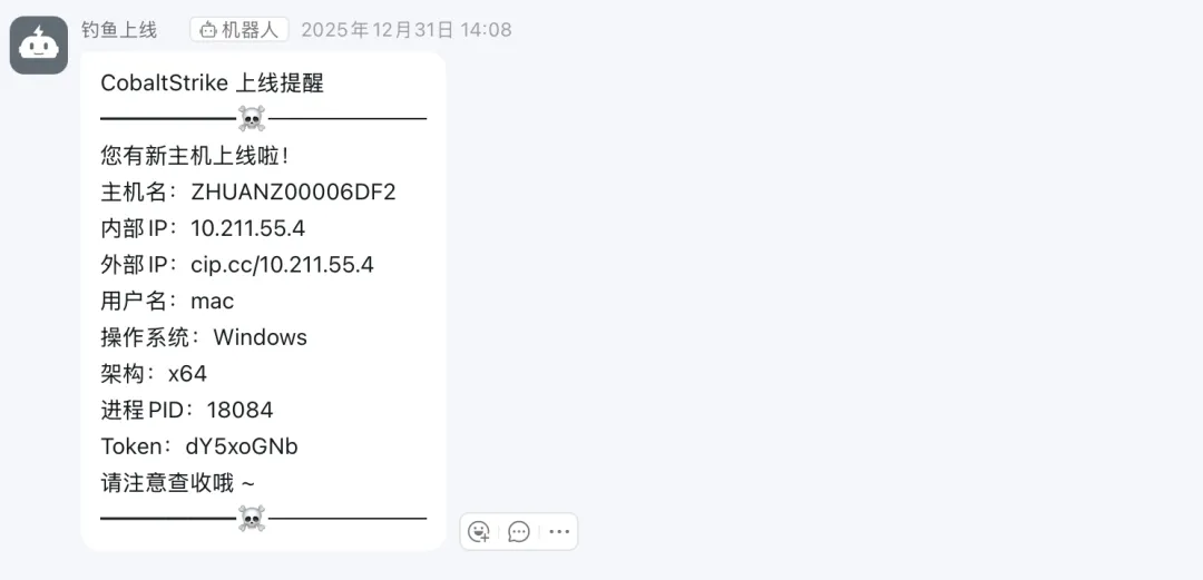 # TeamServer Bot Notification Configuration# 机器人通知配置文件[bot_notification]# 企业微信机器人配置# WeChat Work Bot Configurationenable_wechat = falsewechat_key =# 钉钉机器人配置# DingTalk Bot Configurationenable_dingding = falsedingding_key =# 飞书机器人配置# Feishu/Lark Bot Configurationenable_feishu = falsefeishu_key =