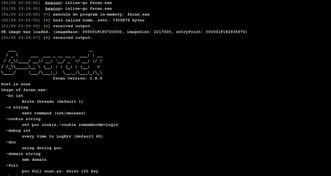 fscan Usage:fscan load # 加载 DLL(首次使用)fscan -h 192.168.1.0/24 # 执行扫描fscan -h 192.168.1.0/24 -p 1-65535 # 全端口扫描fscan stop # 停止扫描