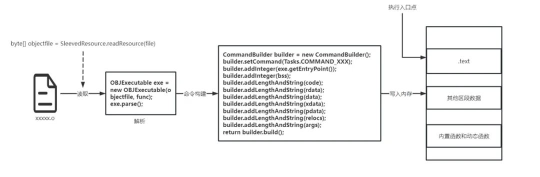 5.增加 BOF 函数解析,支持 .xdata、.pdata、.bbs 区段,动态调用函数提升至 64 个,同时BOF 函数与 CobaltStrike 4.9.1 完全一致。这样可以适配使用市面上大多数的CobaltStrike插件。CS4.9 BOF加载原理如下: