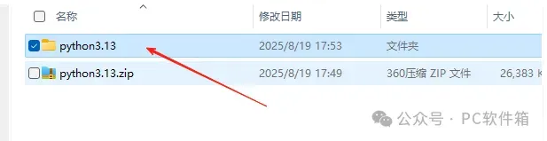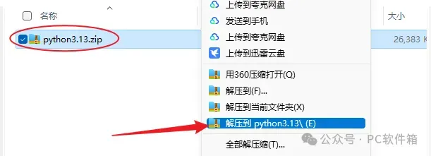 1.解压安装包:鼠标右击【python3.13】压缩包,选择电脑上安装的解压软件,点击解压到【python3.13】。
