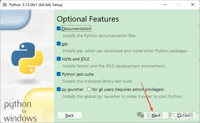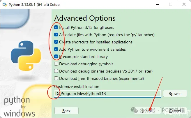 6.①勾选【Install Python 3.13 for all users】②修改路径地址中的第一个字符C可更改安装位置(如:把C改为D软件将安装到D盘)③点击【Install】。