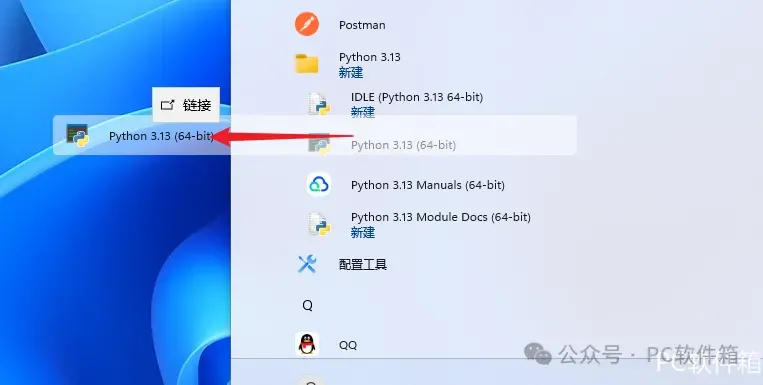 9.创建桌面快捷方式:①点击桌面任务栏中的【开始图标】>点击【所有应用】>双击展开【python3.13】文件夹②将【Python 3.13 64-bit】图标拖到电脑桌面。