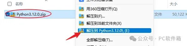 1.解压安装包:鼠标右击【python3.12】压缩包,选择电脑上安装的解压软件,点击解压到【python3.12】。