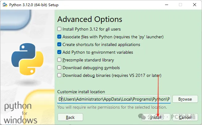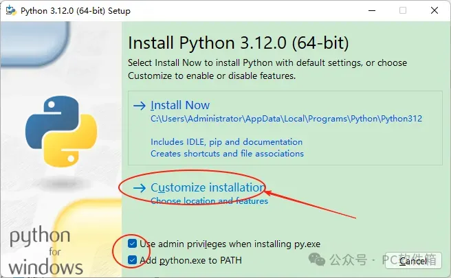 4.勾选【Use admin……】和【Add python……】,点击【Customize installation】。