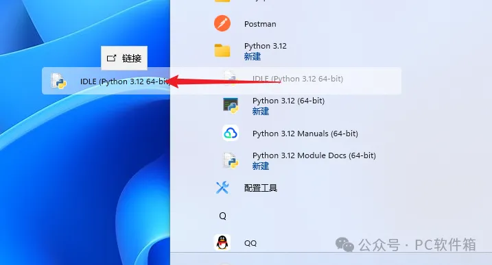 9.创建桌面快捷方式:①点击桌面任务栏中的【开始图标】>点击【所有应用】>双击展开【python3.12】文件夹②将【IDLE (Python 3.12 64-bit)】图标拖到电脑桌面。
