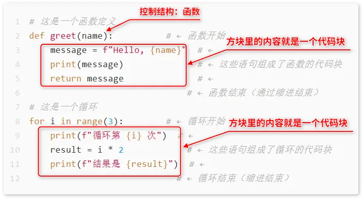 代码块是受控制结构管理的一组语句的集合。它就像一个“包裹”,里面的代码统一整体执行。
