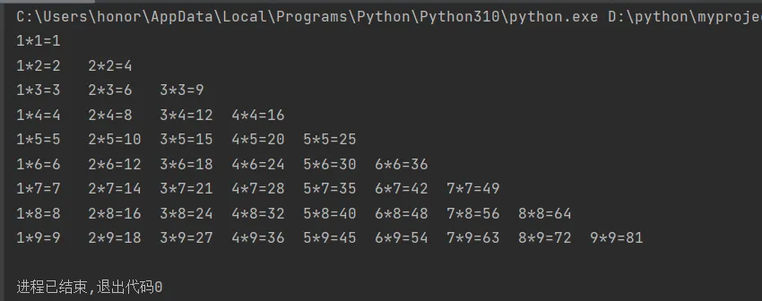 for i in range(1,10): # 控制行 for j in range(1,i+1): #控制列 print(f'{j}*{i}={i*j}',end='\t') # 字符串进行格式化 print() # 控制换行