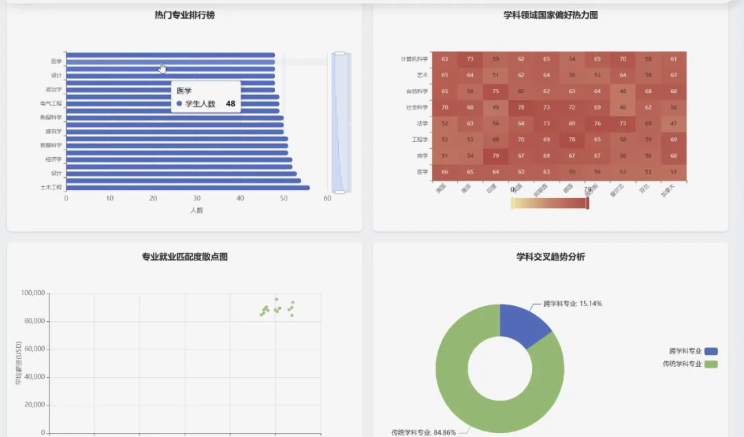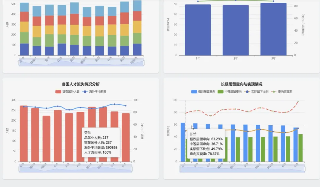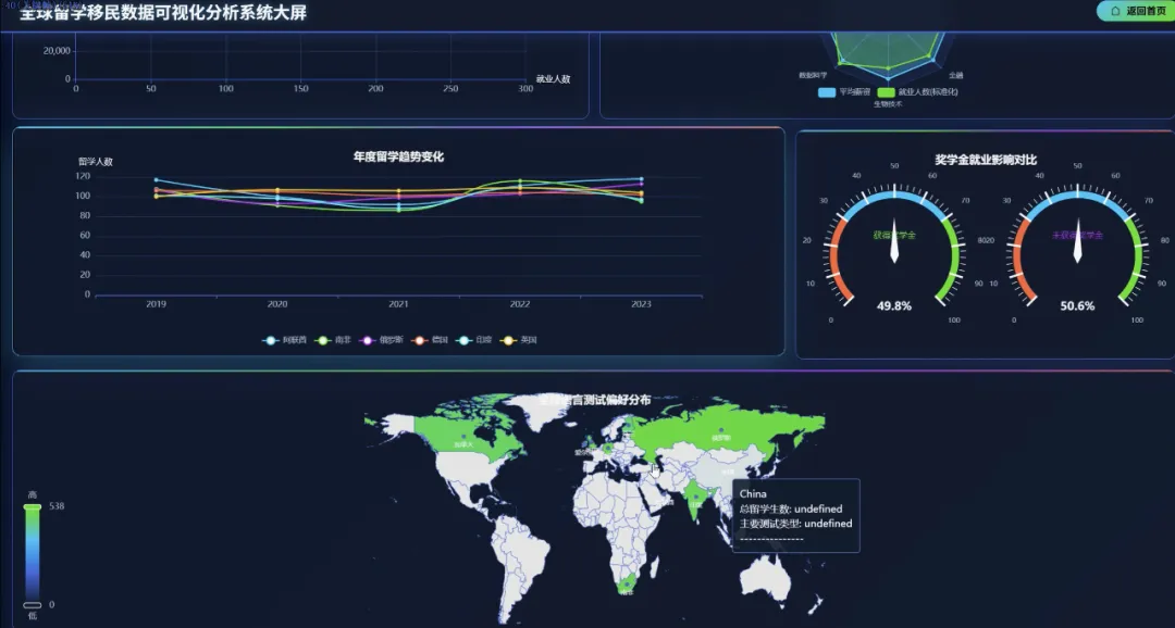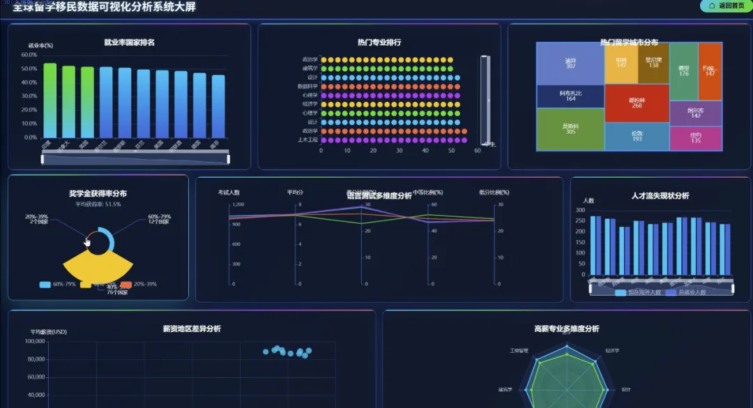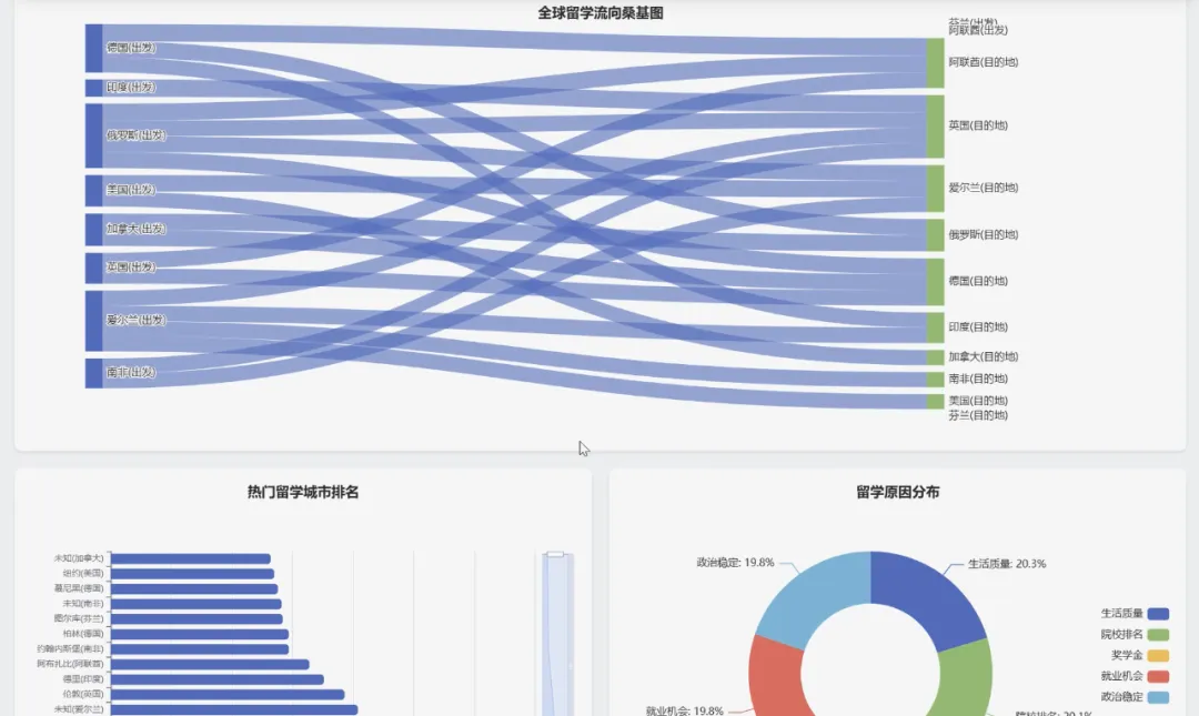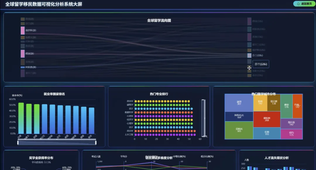 from pyspark.sql import SparkSessionfrom pyspark.sql.functions import col, count, avg, when, litspark = SparkSession.builder.appName("GlobalMigrationAnalysis").getOrCreate()df = spark.read.csv("hdfs://namenode:9000/input/global_student_migration.csv", header=True, inferSchema=True)# 功能一:全球留学流向分析,统计Top10热门留学路径def analyze_global_flow(): flow_df = df.groupBy("origin_country", "destination_country").agg(count("*").alias("student_count")).orderBy(col("student_count").desc()) flow_df.show(10) flow_df.coalesce(1).write.mode("overwrite").option("header", "true").csv("hdfs://namenode:9000/output/global_flow_analysis")# 功能二:学科专业选择分析,找出平均起薪最高的前5个专业def analyze_major_salary(): # 过滤掉未就业的学生 placed_df = df.filter(col("starting_salary_usd") > 0) major_salary_df = placed_df.groupBy("course_name").agg(count("*").alias("graduate_count"), avg("starting_salary_usd").alias("avg_salary")).orderBy(col("avg_salary").desc()) major_salary_df.show(5) major_salary_df.coalesce(1).write.mode("overwrite").option("header", "true").csv("hdfs://namenode:9000/output/major_salary_analysis")# 功能三:就业与薪资分析,分析留学生毕业后留在留学国与回国的比例def analyze_employment_retention(): # 过滤掉未就业且就业国家不为"N/A"的学生 employed_df = df.filter((col("placement_status") == "Placed") & (col("placement_country") != "N/A")) # 判断是否留在留学国工作 retention_df = employed_df.withColumn("retention_status", when(col("destination_country") == col("placement_country"), lit("留在留学国")).otherwise(lit("去往其他国家或回国"))) # 按留学国家和留存状态分组统计 final_retention_df = retention_df.groupBy("destination_country", "retention_status").agg(count("*").alias("student_number")).orderBy("destination_country", "student_number") final_retention_df.show() final_retention_df.coalesce(1).write.mode("overwrite").option("header", "true").csv("hdfs://namenode:9000/output/employment_retention_analysis")analyze_global_flow()analyze_major_salary()analyze_employment_retention()