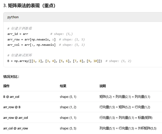 # 示例,验证自己的理解:arr = np.array([1, 2, 3, 4, 5])# 问题:# 1. arr.shape 是什么? (5,)# arr.shape 是 (5,)。这是一个一维数组,有5个元素。# 2. arr[np.newaxis, :].shape 是什么? (1, 5)# arr[np.newaxis, :] 相当于在第一个维度上增加一个维度,变成二维数组。# 原来的一维数组变成了一个行向量(1行5列)。所以形状是(1, 5)。# 3. arr[:, np.newaxis].shape 是什么? (5, 1)# 4. 这三种形状在矩阵乘法中如何表现?# 如果你无法立即回答,说明你对维度的理解是表面的