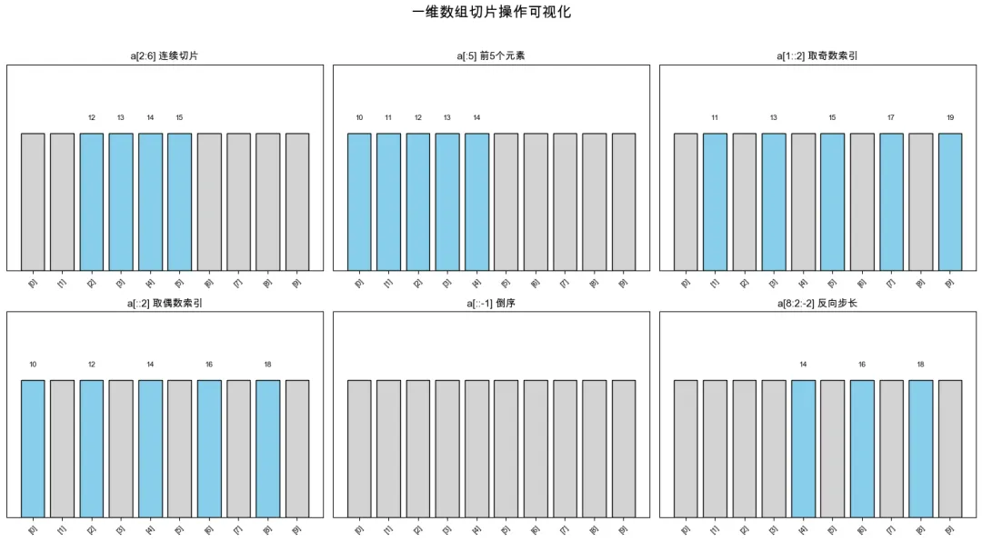 # 1.1.1 连续切片print_section("1.1 连续切片", 2)slice1 = a[2:6] # 索引2到5(包含2,不包含6)print("a[2:6]:", slice1) # 12, 13, 14, 15# 1.1.2 省略开始/结束索引print("\n1.2 省略开始/结束索引")print("a[:5]:", a[:5]) # 前5个元素: 10, 11, 12, 13, 14print("a[5:]:", a[5:]) # 从索引5开始: 15, 16, 17, 18, 19print("a[:]:", a[:]) # 整个数组# 1.2 固定步长切片print_section("1.2 固定步长切片", 2)# 步长为2(取偶数索引元素)print("步长为2(每隔一个取一个):")print("a[::2]:", a[::2]) # 10, 12, 14, 16, 18# 从索引1开始,步长为2(取奇数索引元素)print("\n从索引1开始,步长为2(取奇数索引元素):")print("a[1::2]:", a[1::2]) # 11, 13, 15, 17, 19# 1.3 倒序切片print_section("1.3 倒序切片", 2)print("a[::-1]:", a[::-1]) # 倒序: 19, 18, 17, ..., 10print("a[8:2:-2]:", a[8:2:-2]) # 从索引8到2,步长为-2: 18, 16, 14