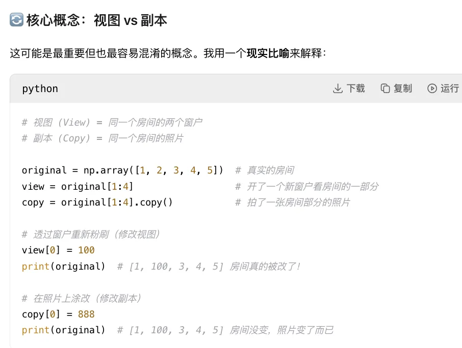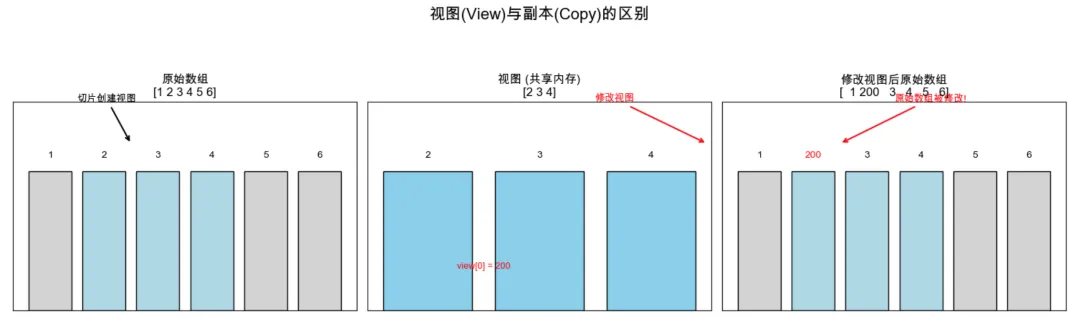 # 4.1 创建示例print_section("4.1 视图与副本的区别", 2)original = np.array([1, 2, 3, 4, 5, 6])print("原始数组 original:", original)# 创建视图(切片)view = original[1:4] # 视图,共享数据print("\n创建视图: view = original[1:4]")print("视图 view:", view)# 创建副本copy = original[1:4].copy() # 副本,独立数据print("创建副本: copy = original[1:4].copy()")print("副本 copy:", copy)# 4.2 修改视图会影响原始数组print_section("4.2 修改视图会影响原始数组", 2)view[0] = 200print("修改 view[0] = 200 后:")print("视图 view:", view)print("原始数组 original:", original) # 原始数组被修改了!# 4.3 修改副本不会影响原始数组print_section("4.3 修改副本不会影响原始数组", 2)copy[0] = 888print("修改 copy[0] = 888 后:")print("副本 copy:", copy)print("原始数组 original:", original) # 原始数组不变# 4.4 检查内存共享print_section("4.4 检查内存共享", 2)print("np.may_share_memory(original, view):",np.may_share_memory(original, view)) # Trueprint("np.may_share_memory(original, copy):",np.may_share_memory(original, copy)) # False