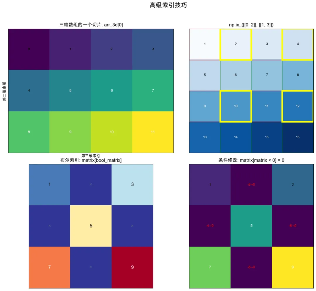# 6.1 使用省略号(...)print_section("6.1 使用省略号(...)", 2)# 创建三维数组arr_3d = np.arange(24).reshape(2, 3, 4)print("三维数组 arr_3d 形状:", arr_3d.shape)print("第一个二维切片:")print(arr_3d[0])print("\n使用省略号:")print("arr_3d[..., 0]: 所有维度的第一个元素")print(arr_3d[..., 0])print("\narr_3d[0, ...]: 第一维的第一个元素")print(arr_3d[0, ...])# 6.2 使用np.ix_()进行网格索引print_section("6.2 使用np.ix_()进行网格索引", 2)matrix = np.array([[1, 2, 3, 4],[5, 6, 7, 8],[9, 10, 11, 12],[13, 14, 15, 16]])