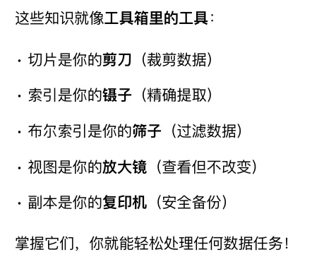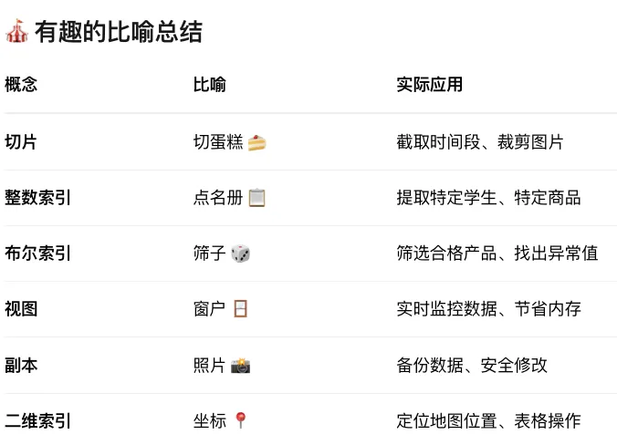 # 5.1 取出单一元素print_section("5.1 取出单一元素", 2)print("arr_2d[0, 0]:", arr_2d[0, 0]) # 第1行第1列: 1print("arr_2d[2, 3]:", arr_2d[2, 3]) # 第3行第4列: 12print("arr_2d[-1, -1]:", arr_2d[-1, -1]) # 最后一行最后一列: 16# 两种方式的区别print("\n两种索引方式的区别:")print("arr_2d[0][0]:", arr_2d[0][0]) # 先取行,再取列print("arr_2d[0, 0]:", arr_2d[0, 0]) # 直接行列索引print("两者结果相同,但 arr_2d[0][0] 实际上是两个操作")# 5.2 取出行print_section("5.2 取出行", 2)print("arr_2d[0]:", arr_2d[0]) # 第1行: [1, 2, 3, 4]print("arr_2d[0, :]:", arr_2d[0, :]) # 同上print("arr_2d[-1]:", arr_2d[-1]) # 最后一行: [13, 14, 15, 16]# 取多行print("\n取多行:")print("arr_2d[[0, 2]]:\n", arr_2d[[0, 2]]) # 第1行和第3行print("arr_2d[0:2]:\n", arr_2d[0:2]) # 第1行到第2行(不包含第3行)# 5.3 取出列print_section("5.3 取出列", 2)print("arr_2d[:, 0]:", arr_2d[:, 0]) # 第1列: [1, 5, 9, 13]print("arr_2d[:, -1]:", arr_2d[:, -1]) # 最后一列: [4, 8, 12, 16]# 取多列print("\n取多列:")print("arr_2d[:, [0, 2]]:\n", arr_2d[:, [0, 2]]) # 第1列和第3列print("arr_2d[:, 1:3]:\n", arr_2d[:, 1:3]) # 第2列到第3列# 5.4 取出子矩阵print_section("5.4 取出子矩阵", 2)print("arr_2d[1:3, 1:3]:\n", arr_2d[1:3, 1:3]) # 2x2子矩阵print("arr_2d[::2, ::2]:\n", arr_2d[::2, ::2]) # 隔行隔列取样