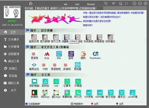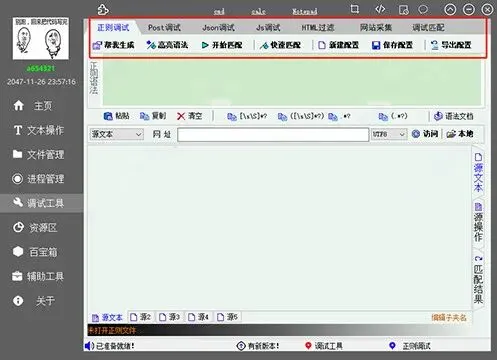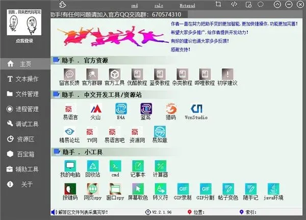 它把汇编转换、CE辅助、位运算、正则调试、Post调试、Json调试、Js调试等常用调试和辅助工具打包到一起,还涵盖了进程管理、文件管理、文本操作等系统级功能,相当于一个本地版的“开发百宝箱”。