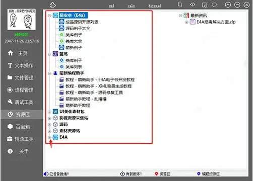 调试、资源、百宝箱、辅助工具四大模块更是锦上添花!调试工具包揽正则、post、json等调试需求,网站采集也能轻松拿捏;资源区有易安卓、蓝茑等海量素材;百宝箱能生成html背景、图形按钮,还能处理e4a源码;辅助工具还支持汇编转换、位运算等功能,简直是编程人的一站式神器