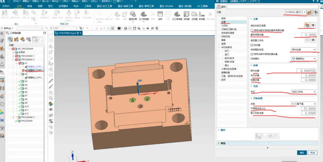 mill_planar 或 mill_contour 模板(根据加工复杂度)。 - 指定工件(Part)和毛坯(Blank),建WORKPIECE