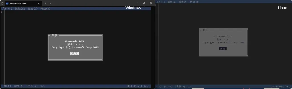 上图是Windows 11版本和Linux版本在界面方面的简单对比。顺便说一下,在Windows版本以及Linux图形界面的终端中,Edit是支持鼠标操作的……