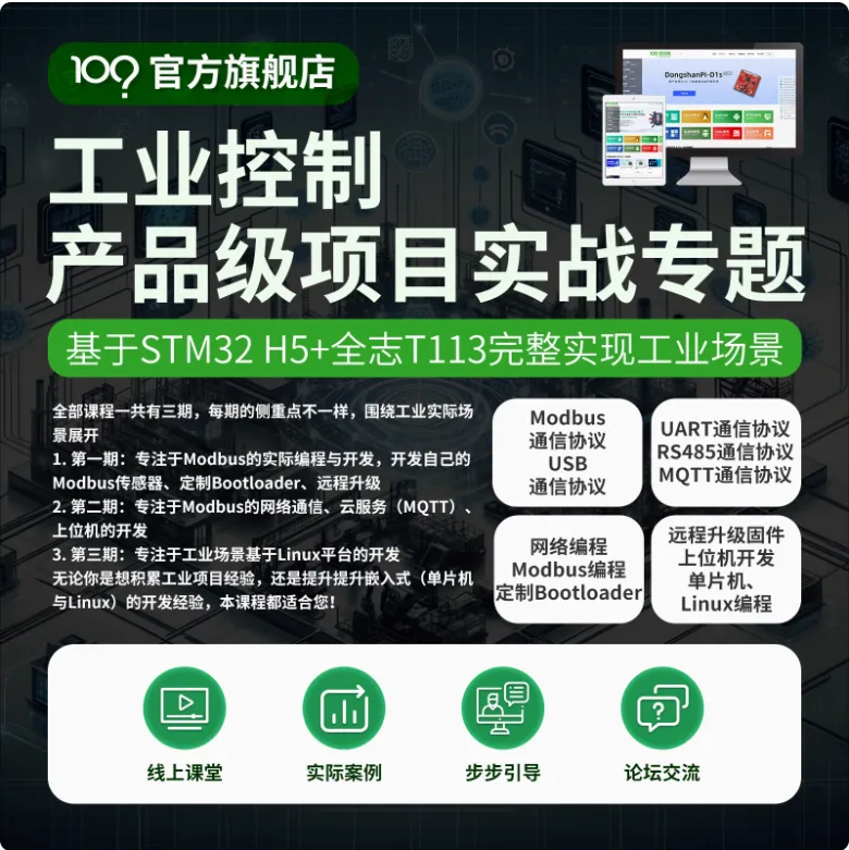 项目1:侧重于单片机,中控使用STM32H5,传感器使用STM32F030。项目2:侧重于网络,在单片机上实现socket接口操作WIFI模块,MQTT、Modbus TCP、使用LVGL开发上位机。 项目3:侧重于Linux,QT+后台,LVGL+后台。全场景工业互联第一期 第二期 第三期 都已全部课程都已经更新上传完毕!