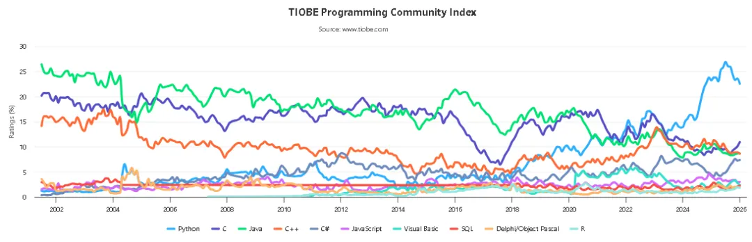 在 2025 年的前十名中也出现了一些有趣的变化。C 和 C++ 互换了位置。尽管 C++ 正以前所未有的速度发展,其中一些更激进的变化——例如模块(modules)概念——尚未在业界广泛采纳。与此同时,C 依然简单、快速,非常适合日益增长的小型嵌入式系统市场。即便如此,Rust 在这一领域仍然难以渗透,尽管本月其排名达到了历史最高的第 13 位。