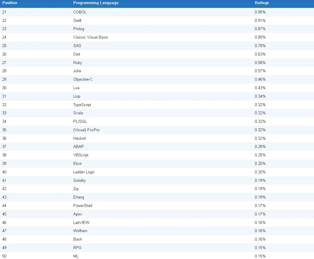 下面列出了完整的前 50 名编程语言。此概览为非正式发布,因为可能存在我们遗漏某种语言的情况。