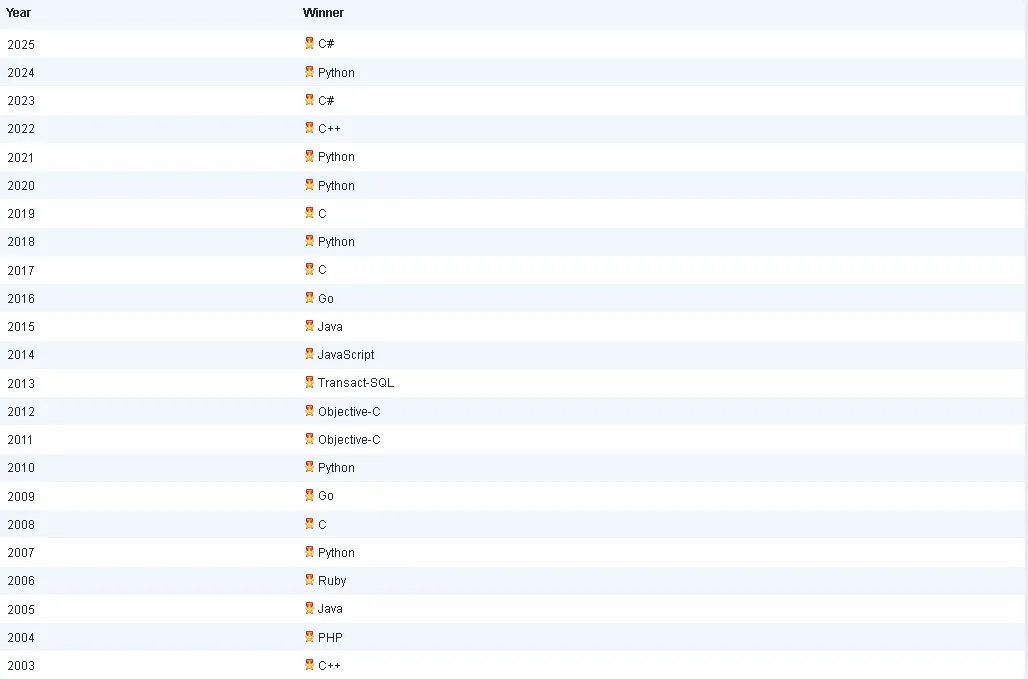 下方列出了所有“年度编程语言”获奖者(编程语言名人堂)。该奖项颁给在某一年中评分涨幅最大的编程语言。