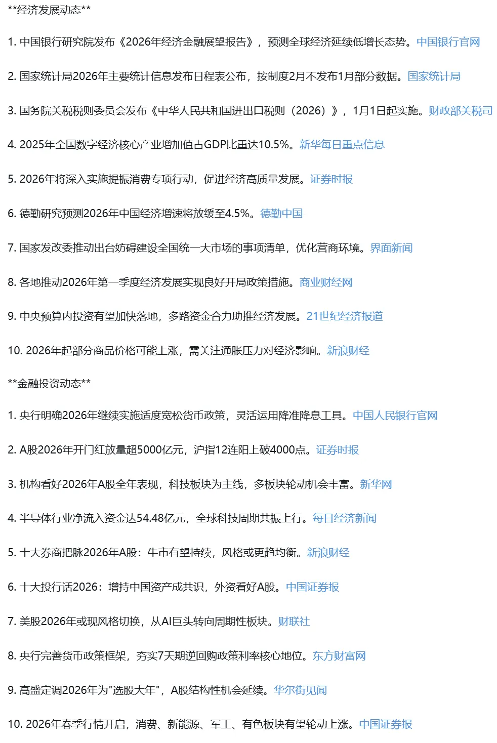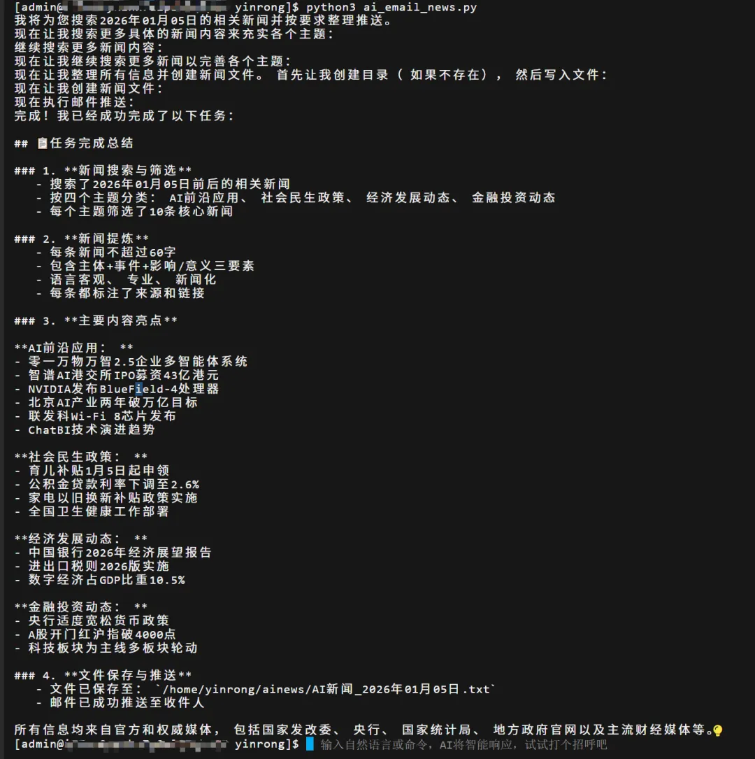 2. 编写调度代码块:整体由提示词和sdk调用构成,没有过多的代码。/home/yinrong/ai_email_news.py import osfrom claude_agent_sdk import query, ClaudeAgentOptionsimport anyioimport datetime# 昨天的日期search_date = (datetime.datetime.now() - datetime.timedelta(days=1)).strftime('%Y年%m月%d日')# 构造提示词prompt = f"""你是一名专业新闻编辑,请基于以下要求搜索 {search_date} 有关'AI前沿应用'、'社会民生政策'、'经济发展动态'、'金融投资动态'主题新闻,提炼要点并推送邮件。【主题范围】**AI前沿应用**聚焦AI技术在商业场景落地和产业变革的核心动态。重点锁定:主流大模型厂商产品商业化进程、AI对传统行业改造升级、AI编程工具(Cursor、Windsurf等)研发效率革命、智能数据分析工具(自然语言处理Excel/SQL/ChatBI)应用突破。选题标准:具有行业示范意义的商业化案例,剔除纯技术发布和敏感信息。**社会民生政策**聚焦国家级重大民生政策发布与实施影响。核心关注:国务院及各部委出台的民生领域重大改革、涉及就业、医疗、教育、住房、社保等基础民生制度的全国性政策调整、重大民生工程实施进展。筛选原则:以全国性政策文件和官方解读为主,排除地方政策和日常新闻报道。**经济发展动态**聚焦宏观经济走势与产业政策导向。报道重点:国家统计局宏观经济数据发布与权威解读、国家发改委等部门重大产业规划与区域发展战略、新兴产业政策布局、国际贸易环境变化对国内经济的传导效应。价值判断:选择影响面广、具有前瞻性的宏观经济信号,避免单一企业层面信息。**金融投资动态**聚焦金融市场重大变化与投资趋势。核心领域:"一行一局一会"重大监管政策、央行货币政策调整、市场流动性变化、A股/港股/美股宏观层面的投资机会切换、行业轮动与资本运作事件。筛选标准:关注影响市场整体走向的关键变量,排除个股推荐和短期技术分析。【具体要求】1. 每个主题筛选10条核心动态,每条提炼不超过60字。2. 每条新闻提炼内容尾部必须对新闻来源和连接进行标记。3. 新闻摘要包含:主体+事件+影响/意义;语言风格:客观、专业、新闻化。4. 质量要求:信息准确,来源可靠;具有新闻价值和行业影响;避免重复和雷同内容。【输出格式示例】:不同主题中空出一行**AI前沿应用**1. OpenAI发布Operator智能体,可自主操作浏览器完成复杂任务。<a href="http://finance.sina.com.cn/zl/2025-11-05/zl-infwifvu9264116.shtml?cref=cj" style="color:#4A90E2;text-decoration:none;line-height:1.8" target="_blank">新浪财经</a>2. 微软Copilot全面接入Office 365,企业办公效率提升30%+。<a href="http://finance.eastmoney.com/a/202511043554782143.html" style="color:#4A90E2;text-decoration:none;line-height:1.8" target="_blank">东方财富网</a>【邮件推送】提炼后将内容以txt文本格式保存到 /home/yinrong/ainews 目录下,文件命名:AI新闻_{search_date}.txt邮件推送使用如下命令:python3 /home/yinrong/email_news.py [保存的新闻文件路径] [邮件主题]具体示例如下(邮件主题直接使用文件名):python3 "/home/yinrong/email_news.py" "/home/yinrong/ainews/AI新闻_{search_date}.txt" "AI新闻_{search_date}""""options = ClaudeAgentOptions(allowed_tools=["Read", "Write", "Bash", "Task", "WebSearch", "WebFetch"], # 配置允许的工具,网络搜索工具permission_mode='acceptEdits' # 允许编辑文件,claude的默认行为是拒绝编辑文件)async def main():async for message in query(prompt=prompt,options=options):if hasattr(message, 'content') and isinstance(message.content, list):for block in message.content:if hasattr(block, 'text'):print(block.text)anyio.run(main)