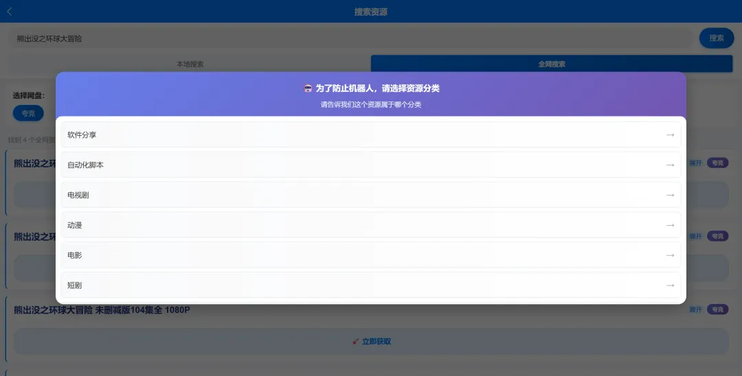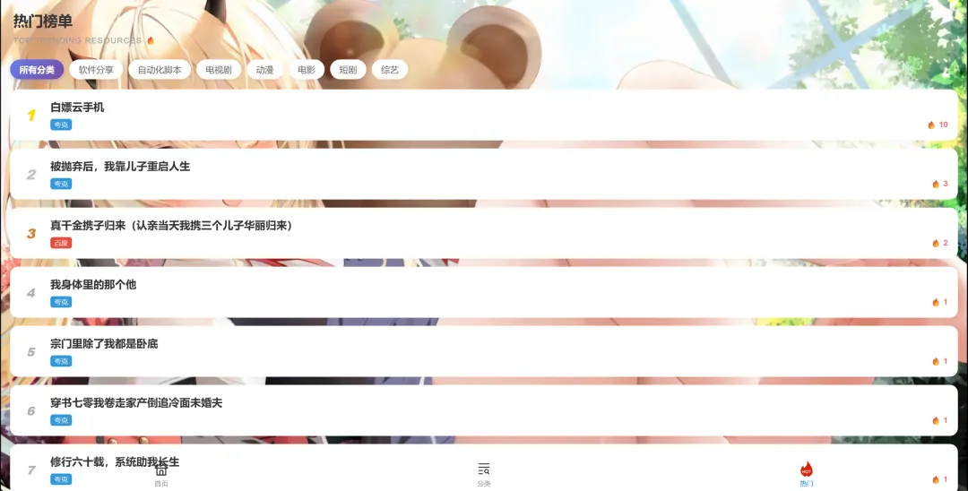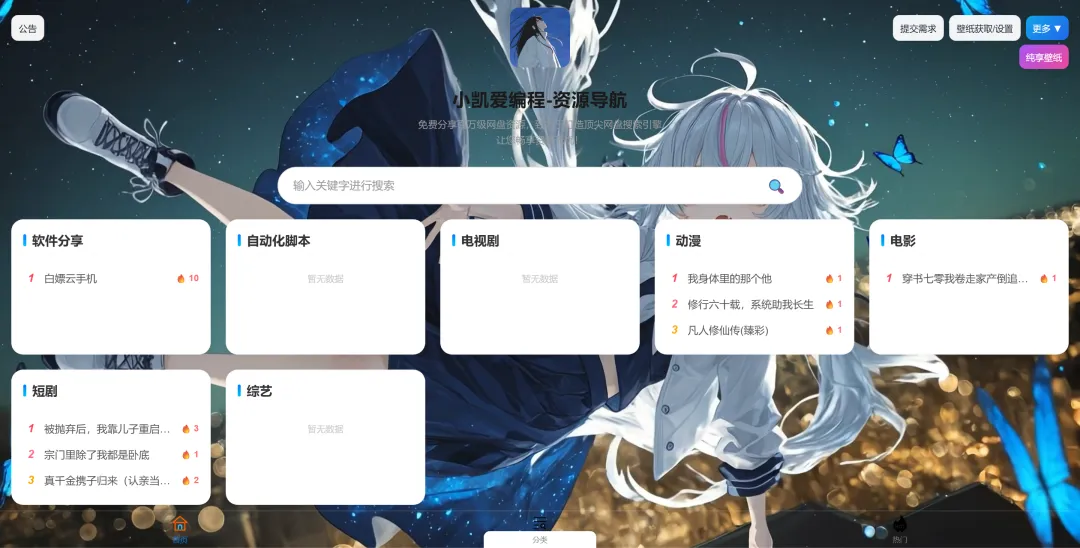 我会先做腾讯云宝的白嫖会员,这个很快,预期后台晚上就可以上线了,大家等等看吧,下面介绍今天的主角: 资源导航第二步:需要什么资源直接搜(本地搜没有就全网搜),全网搜默认展示20条数据,没有你想要的就继续展示全部即可(搜索关键字月明确搜索月精确)第三步:点击立即获取,选择分类,扫码保存(手机端可以点击下面的立即转存就会跳转啦)第四步:公告信息大家及时观看哦,如果什么找不到可以填一下需求提交第五步:对壁纸感兴趣的,可以在壁纸获取欣赏或者获取哦