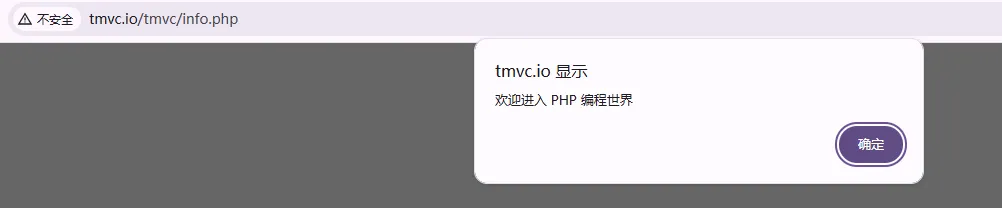 <?phpheader('Content-Type: text/html; charset=utf-8');?><!-- 第1行:声明文档类型和HTML结构 --><!DOCTYPE html><htmllang="zh-CN"><head> <metacharset="UTF-8"> <!-- 字符集设置为UTF-8 --> <title>PHP 输出 JavaScript 示例</title></head><body> <!-- 第2部分:PHP 动态生成 JavaScript --> <?php // 使用 echo 输出一段 JavaScript 代码 echo "<script>"; echo "alert('欢迎进入 PHP 编程世界');"; // 弹窗显示欢迎信息 echo "</script>"; ?> <!-- 可选:页面上显示其他内容 --> <h1>Hello from PHP!</h1> <p>这个页面是由 PHP 动态生成的,并且包含了 JavaScript 弹窗。</p></body></html>