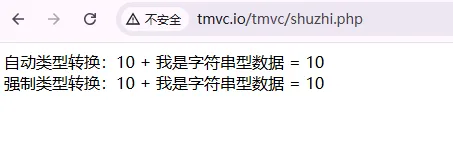 <?php$num = 10;$str = "我是字符串型数据";// 先检查是否为合法数字或可转为数字的字符串if(is_numeric($str)) { $result = $num + $str;} else { // 如果不是数字,则设为默认值 0 $result = $num + 0; // 如果需要提示,可以取消下面这行注释 // echo "警告:'{$str}' 不是有效的数字字符串,已自动补零。<br>";}// 输出第一部分:自动类型转换的结果(换行)echo "自动类型转换:{$num} + {$str} = {$result}";echo "<br>"; // ← 这里是关键:添加一个 HTML 换行标签// 强制类型转换示例$forcedStr = (int)$str; // 尝试把非数字字符串转为整数 → 得到 0// 输出第二部分:强制类型转换的结果(换行)echo "强制类型转换:";echo $num . " + " . $str . " = ";echo $num + $forcedStr;echo "<br>"; // 再次换行,使输出更整洁
