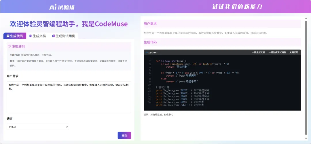 义务教育信息科技教学指南五年级《身边的算法》这一主题中,有大量的算法验证教学场景,教师若自身编程经验有限,编写一个完整且规范的代码案例可能需要数小时查阅资料、反复调试。使用“灵智编程助手CodeMuse”,只需要输入你的需求,就可以快速生成规范完整的代码,以“闰年平年我知道”一课为例,生成一个可以判断平年/闰年的代码。