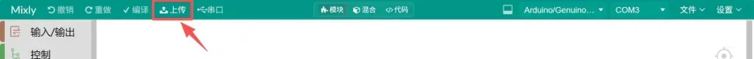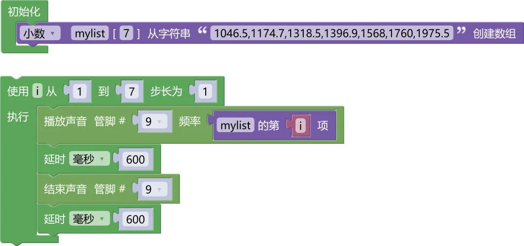 这节课我们将继续使用初始化程序指令来初始化程序设置;使用[整数][mylist]从字符串"0,0,0"创建数组程序指令创建数组;使用有限循环程序指令设置程序循环次数;使用播放声音管脚#[0]频率[NOTE_C3]程序指令设置蜂鸣器的声音频率等。Step1:用 USB 数据线将你的Arduino Uno开发板连接到电脑。Step2:在菜单栏开发板选项中选择[Arduino/Genuino UNO]型号开发板。Step3:选择开发板对应的端口号(COM X)。Step4:选好端口后,可以点击编译按钮进行程序编译。Step5:编译完成之后,可以点击上传按钮进行烧录上传。 编译上传完成之后,可以听到无源蜂鸣器发出的音律声音效果!