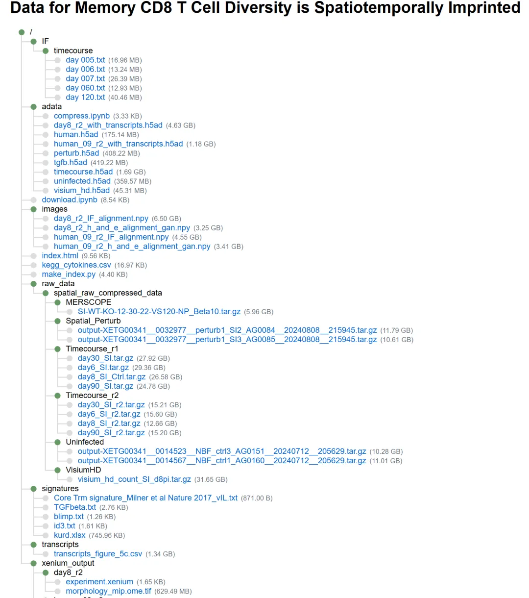 昨天,我们学习了这篇2025 年1月22号发表在Nature杂志上的文献,标题为《Tissue-resident memory CD8 T cell diversity is spatiotemporally imprinted》,里面给了代码和处理好的数据,但是数据呢,那是相当大啊,而且还有很多文件。如下,下载可能是个难题!