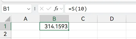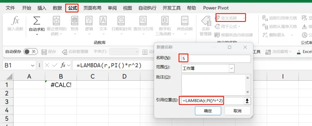 之后,我们在工作簿中,就可以直接使用S来计算圆面积了。
